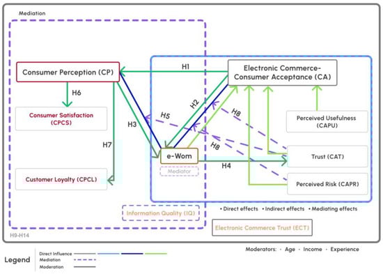 Additionally, the interconnections among the three variables and their components were examined. For electronic commerce, the strongest scores were recorded for CARR, CAPEU, and CAPU. For electronic word of mouth, the strongest relationships were found for EWMT, EWMIQ, EWMPI, and EWMSD. Consumer perception was primarily defined by CPC, CPI, CPCS, and CPC, confirming all secondary hypotheses (H1–H14).