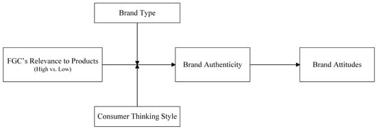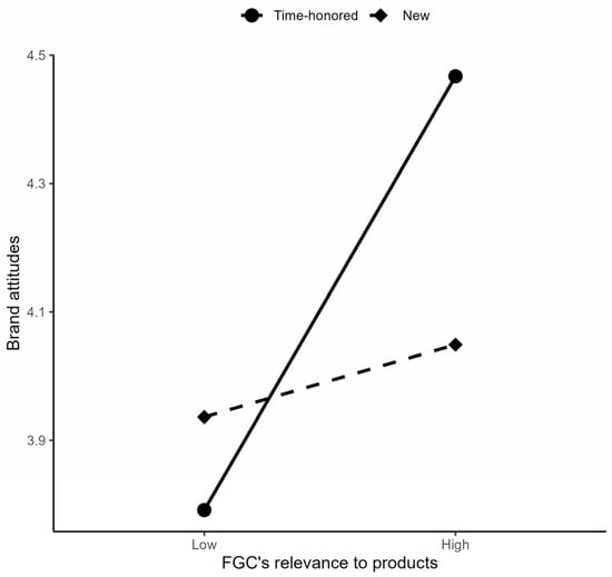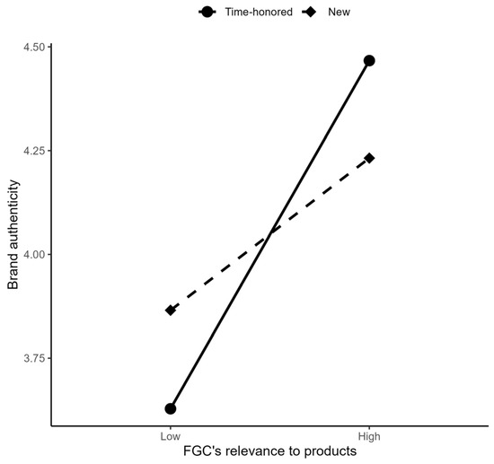 Drawing on consumer inference theory, consumers use their general brand preferences to infer product attributes such as quality or taste [23]. For time-honored brands, expectations are strongly tied to product attributes [47,48]. High product-relevant FGC aligns with these expectations, enhancing perceptions of brand authenticity and attitudes. In contrast, for new brands, which are more aligned with contemporary values [43,49], consumer expectations of FGC’s relevance are weaker. Therefore, we propose that, for time-honored brands, FGC’s relevance to products has a stronger effect on brand authenticity and attitudes than for new brands. Thus, we proposed the following hypothesis: