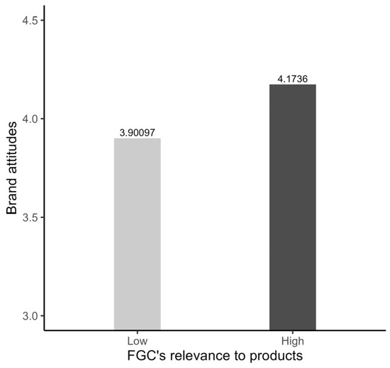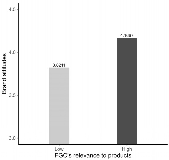As shown in Figure 3, the results of a one-way ANOVA of brand attitudes revealed that high (vs. low) product-relevant FGC significantly increased brand attitudes (M_high = 4.1667, SD = 0.6450; M_low = 3.8211, SD = 0.7996; F (1, 79) = 4.569, p < 0.05), thus confirming H1.