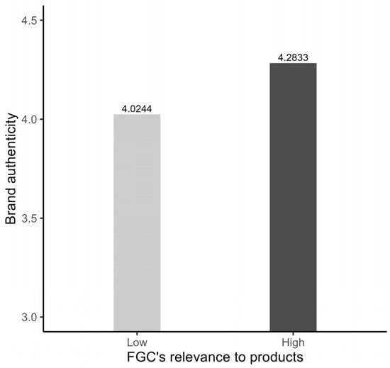 As shown in Figure 4, the results of a one-way ANOVA showed that brand authenticity in the high product-relevant FGC group was significantly higher than that in the low product-relevant FGC group (M_high = 4.2833, SD = 0.45636; M_low = 4.0244, SD = 0.65993; F (1, 79) = 4.199, p < 0.05). This implies that high product-relevant FGC enhances brand authenticity more effectively than low product-relevant FGC.