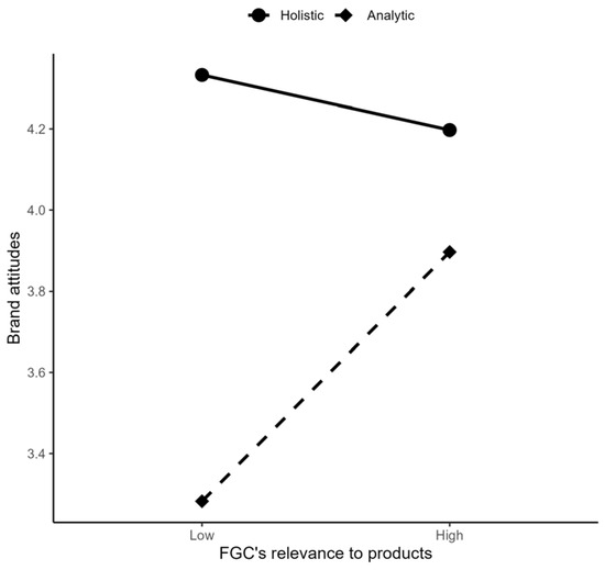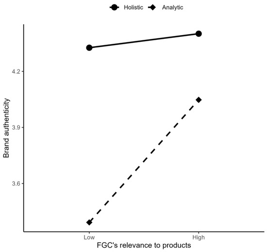 Given the above distinguishing holistic and analytic thinking styles, we concluded that holistic-thinking consumers adopt a more integrative approach [51,52], viewing FGC’s relevance to products as merely one criterion in their brand evaluation. In contrast, analytic-thinking consumers focus on FGC’s relevance as a key criterion [19,50]. Hence, we inferred that FGC’s relevance to products would have a stronger positive effect on brand authenticity and attitudes for analytic-thinking consumers than for holistic-thinking ones. Based on this, we developed the following hypothesis: