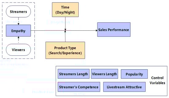 Furthermore, live shopping has become a preferred choice for many consumers, who may make quick purchase decisions influenced by specific factors. Our research model includes these potential influencing factors on live sales as control variables. By controlling for factors related to live streams, streamers, and viewers, we can eliminate their possible impact on consumer psychology and behavior, allowing for a deeper exploration of empathy’s specific effect on sales. This approach enhances the reliability of the results and provides insight into the potential mechanisms of empathy transmission in live commerce. Based on these hypotheses, the model of this study is illustrated in Figure 1.
