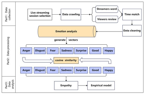 Empathy describes the emotional matching between hosts and viewers during live broadcasts. The measurement of empathy involves three main steps: Firstly, we collect textual data from host product descriptions and interactions with viewers, aligning viewer comments with natural pauses in the host’s speech. Emojis from viewer messages are removed to facilitate subsequent analysis. Secondly, the processed host–viewer text undergoes sentiment analysis using the sentiment ontology library developed by the Dalian University of Technology Institute of Information Retrieval (DUTIR), following the approach by [67]. Each text segment is analyzed for word frequency counts related to joy, sadness, surprise, anger, disgust, fear, and liking. Finally, using Python, we represent the emotions generated by hosts and viewers during natural pauses as vectors (denoted as Vector1-streamers and Vector2-viewers, respectively) and calculate their similarity using the cosine similarity algorithm to derive the empathy values (Empathy ∈ [0, 1]) needed. The construction process of empathy is illustrated in Figure 2.