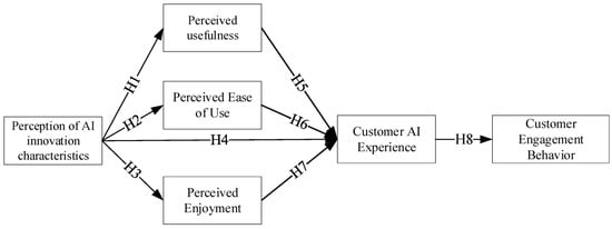 Customer engagement, as the “twin brother” of customer experience, has been extensively studied recently in the interactive marketing literature [31,32,33,34]. For instance, the relationship between customer engagement and customer value forms a natural alliance within customer experience, collectively constituting the trinity of marketing [20]. Digital customer engagement further increases consumer participation in various social media platforms with a significant impact on marketing strategic implications [35,36]. Various conceptualizations and measurements of customer engagement can be categorized into four main dimensions: psychological states, customer behaviors, company value-add mechanisms, and intrinsic motivations. Customer engagement behavior refers to actions taken by customers beyond the purchase, driven by motivation towards a brand or company, such as word-of-mouth activities, recommendations, assisting other customers, blogging, writing reviews, and engaging in legal actions. A positive artificial intelligence (AI) service experience motivates customers to integrate more physically, mentally, socially, and emotionally with the company [37]. Previous research has shown that customer engagement behaviors can bring significant benefits to companies, such as improved company performance, support for new product development, promotion of service innovation, and intangible benefits like attracting more customers [38,39]. This paper incorporates both customer AI experience and customer engagement behaviors into the Technology Acceptance Model because, in the context of e-commerce platforms, the customer AI experience serves as a response to the use of AI services and can effectively measure usage attitude, which is a key component in the classic TAM model.