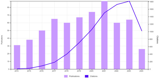 Figure 2 illustrates the yearly frequency of papers published from 2014 to 2024 for the 623 articles analyzed. In this figure, the bars represent the number of publications, while the line represents the number of citations. The total number of citations for all publications during this period was 8541, resulting in an average of 13.71 citations per publication.