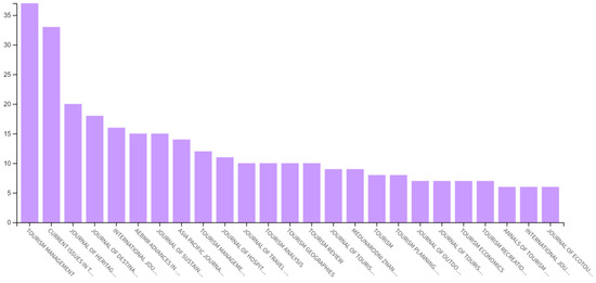 Figure 3 illustrates the most prominent journals associated with the keywords in the study within the WoS database. The leading journal is “Tourism Management”, with 37 publications, forming 5.939% of the 623 publications analyzed. Following closely is “Current Issues in Tourism”, contributing 33 publications, or 5.297% of the total. Other significant journals include the “Journal of Heritage Tourism” and the “Journal of Destination Marketing & Management”, contributing 20 and 18 publications, respectively. These four journals account for 17.335% of the overall publications, emphasizing their critical role in disseminating research on advergames and gamification in tourist destinations.