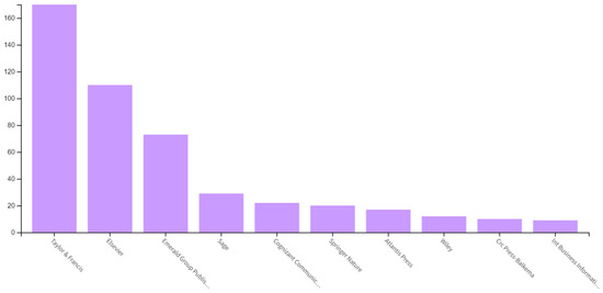 Figure 4 highlights the publishers with the highest number of records in the field of advergames and gamification in tourist destinations. Leading the list is Taylor & Francis, with an impressive 170 records, representing 27.287% of the total 623 publications. Elsevier follows with 110 records, comprising 17.657% of the overall tally. Emerald Group Publishing secures the third position with 73 records, accounting for 11.717% of the total publications.