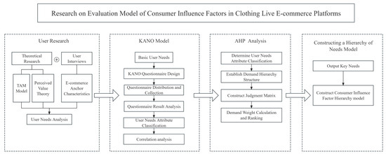 This study employs a combined KANO-AHP model, integrating qualitative and quantitative analyses to address the limitations of using either method alone. It provides fashion live streaming e-commerce platforms with targeted strategies and actionable insights. The research process involves the following four steps: firstly, collecting user needs through surveys and interviews based on the theoretical framework; secondly, applying the KANO model to filter and assess demand relevance; thirdly, using the AHP to calculate and rank indicator weights; and finally, developing a consumer influence factor hierarchy and formulating platform optimization strategies. Figure 2 illustrates the integrated research path of the KANO-AHP model.