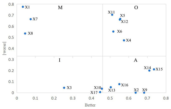 Using the better–worse coefficient, the Pb and Pw values are calculated according to Formulas (6) and (7). The quadrant diagram (Figure 3) is then plotted with the average absolute values of Pb and Pw as the intersection.