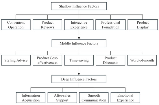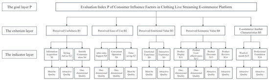 Hierarchical analysis model of consumer influence factors for clothing live streaming e-commerce platform.