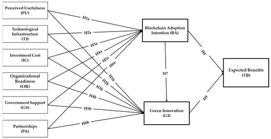 Perceived Usefulness measures the benefits a business can achieve by adopting new technologies or implementing innovative ideas [18,34]. In the context of the supply chain, it serves as a critical factor in evaluating the impact on the intention to adopt new technologies or initiate new projects [33,35,36]. Hence, following the findings of relationships between Perceived Usefulness and Blockchain Adoption Intention and Green Innovation, the authors propose the following hypotheses:
