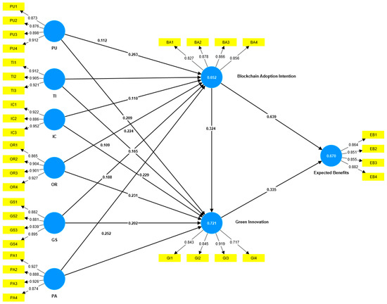 Firstly, the indicator reliability was assessed through the outer loading values of all 34 items, which exceeded the recommended threshold of 0.708, as suggested by [37,59]. Specifically, the outer loading ranges for each construct were as follows: Perceived Usefulness (0.873–0.912), Technological Infrastructure (0.905–0.921), Investment Cost (0.886–0.952), Organizational Readiness (0.865–0.927), Government Support (0.839–0.895), Partnerships (0.871–0.927), Blockchain Adoption Intention (0.827–0.878), Green Innovation (0.717–0.919), and Expected Benefits (0.851–0.882). These results demonstrate that the individual indicators reliably measure their respective constructs. Additionally, the maximum VIF value among all items is 4.509, which is below the threshold of 5.0 [40,59]. This indicates that there is no multicollinearity present in this case study.