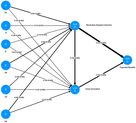 Finally, using the bootstrapping procedure, various indirect relationships within the framework model were assessed and presented. Specifically, the complex pathways linking the six key driving factors (PU, TI, IC, OR, GS, and PA) to the final predictive factor Expected Benefits (EB) were analyzed, highlighting the mediating roles of Blockchain Adoption Intention (BA) and Green Innovation practices (GI), as demonstrated in Table 6.