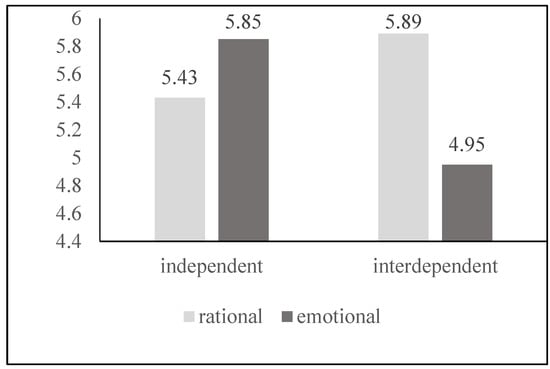 ANOVA was conducted with green product purchase intention as the dependent variable. The results showed that the main effects of advertising appeal (F(1, 184) = 4.29, p = 0.04, η2 = 0.023) and self-construal (F(1, 184) = 3.33, p = 0.07, η2 = 0.018) were not significant, but the interaction effect (F(1, 184) = 30.77, p < 0.001, η2 = 0.143) was significant. For independent self-construal consumers, emotional advertising is more likely to trigger consumers’ purchase intentions (M rational advertising = 5.29, M emotional advertising = 5.76, F(1, 184) = 5.98, p = 0.015, η2 = 0.031); for interdependent self-construal consumers, rational advertising is more likely to trigger purchase intentions (M rational advertising = 5.79, M emotional advertising = 4.76, F(1, 184) = 29.33, p < 0.001,η2 = 0.137), as shown in Figure 1. The results support H1, H1a, and H1b.