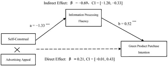 To further examine the mediating effect of information fluency in the interaction, this experiment adopted Model 7 of PROCESS Bootstrap, with the number of iterative samples set to 5000 times []. The results showed that the indirect effect of the interaction between self-construal and advertising appeals on the purchase intention of green products was −0.69 (95% CI: [−1.20, −0.33], excluding 0), indicating that the indirect effect was significant. Specifically, for independent self-construal consumers, the indirect effect of advertising appeals on green product purchase intention was 0.30 (95% CI: [0.10, 0.64], excluding 0), indicating a significant indirect effect. For interdependent self-construal consumers, the indirect effect of advertising appeals on green product purchase intention was −0.39 (95% CI: [−0.68, −0.18], excluding 0), indicating that the indirect effect was significant. This suggests that information fluency plays a mediating role in the effect of the interaction of self-construal and advertising appeals on the purchase intention of green products (Figure 2). Hence, H2 is supported.