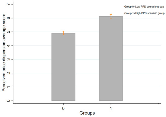 After randomly assigning consumers to the stimulus scenarios, we presented both groups with images and instructions illustrating price dispersion. Respondents were instructed to carefully review the materials, imagine themselves in the given scenario, and complete a scale measuring their perceived price dispersion based on their impressions. They concluded the test by providing basic demographic information. The results indicate that among homogeneous respondents, the high price dispersion scenario elicited significantly higher perceived price dispersion scores compared to the low price dispersion scenario (M_high: 6.13 vs. M_low: 4.91; diff = 1.22; SE = 0.1; t = 12.19; p < 0.01). These findings confirm that our stimulus scenarios effectively and significantly manipulated respondents’ perceived price dispersion. The result can be viewed in Figure 3.