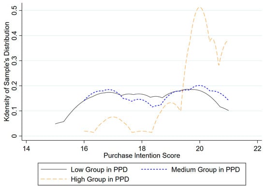 We drew a kernel density graph of the PI for different PPD groups (Figure 4) and observed no significant differences in PI scores between the low- and mid-PPD groups. However, for the high-PPD group, the distribution of PI scores was significantly skewed to the right, indicating that consumers who perceive more significant price dispersion may have significantly higher PIs.