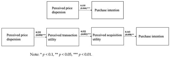 To test this hypothesis, we analyzed the regression results while controlling for respondents’ income and PU. H1 posits that higher perceived price dispersion leads to increased PI. The findings reveal that perceived price dispersion significantly enhances consumers’ PI (β = 0.330, SE = 0.061, t = 5.42, p < 0.01). Consistent with our experimental design, a wider price range leads to greater perceived price dispersion, which, in turn, increases PI. Thus, setting a broader price range appears to effectively boost consumers’ PI. H2 posits a positive mediating effect of perceived transaction utility, which is strongly supported by our findings: higher perceived price dispersion significantly increases perceived transaction utility (β = 0.184, SE = 0.057, t = 3.24, p < 0.01). H3 suggests that perceived acquisition utility acts as a positive mediator between perceived transaction utility and PI. Our results confirm this hypothesis: perceived transaction utility enhances perceived acquisition utility (β = 0.609, SE = 0.062, t = 9.87, p < 0.01), and higher perceived acquisition utility leads to greater PI (β = 0.364, SE = 0.066, t = 5.49, p < 0.01). We also adjusted the control variables to test the influence of personal characteristics and found that these effects were not affected by age, gender, education level, or income (all p-values were greater than 0.05). The regression result can be viewed in Table 1.