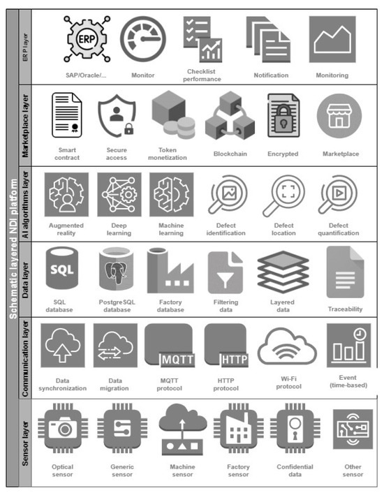 The main challenges of implementing automatic NDIT solutions currently lie in developing the ecosystem or platform that enables data acquisition from heterogeneous and multisource real-time from production lines, data storage, and analytics for inspection purposes [32]. A collaborative network among technology providers, subject matter experts, and customers should integrate cyber-infrastructure competencies that support data acquisition, communication, data management, decision making, marketplace, and intercommunication with Enterprise Resource Planning (ERP). The different licensing models can improve IaaS providers’ cash flow and deliver inspection solutions, while lowering the customer’s CAPEX requirements compared to the traditional business model of pay-before-use [30]. This research investigates the shift from traditional payment fees installed on-premises to new business models in which the non-destructive inspection solution is deployed as IaaS on-premises or on-cloud. The online marketplace platform proposes a layered architecture that relies on non-destructive sensors, databases, the IoT, Blockchain, and Smart Contract technologies to achieve the inspection records’ transparency, auditability, and immutability. Figure 2 describes a proposed layered platform required to implement automatic non-destructive inspection technologies for real-time inspection and quality control purposes.