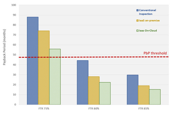 Figure 3 shows the evolution of the payback period after adding the time value of money, and by including the effect of including EMAT inspection technology in the manufacturing of the FTR rate. If a target PbP is set at below 48 months, the target value is reached more quickly when the FTR rate presents values above 75% for all the business model cases. Similarly, it is highlighted for business models under an IaaS license that the payback period decreases below 2 years when using the On-Premise and On-Cloud IaaS models, which presents the best payback periods in the second business model. This indicator is interesting from the company’s point of view when evaluating future investment projects and when aiming to know how long it should take to recover the investment initially made in NDIT. IaaS is justified as a more interesting approach to be taken to implement NDIT for in-process quality assurance.