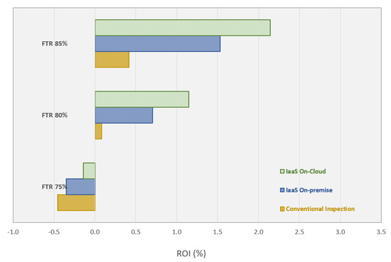 Nevertheless, another economic indicator that can be used to assess the viability of investment in automatic NDIT equipment is the return on investment (ROI). Figure 4 shows the evolution of ROI on a 4-year horizon, where it can be observed again that the service-based business models (IaaS on-premise and on-cloud) report positive values when the first-time manufacturing rate is higher than 75%. Therefore, investment is economically favorable if an automatic non-destructive inspection system is introduced by improving the first-time manufacturing rate by at least 15%. Similarly, Figure 4 shows that the IaaS on-cloud model, with a lower initial investment, provides better ROI values compared to the other IaaS business model based on an installed on-premise system.