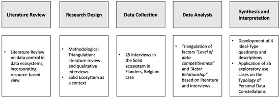 To answer these questions, we employ a mixed-methods approach. First, we conducted 25 semi-structured interviews with private sector actors in the Flemish Social Linked Data (Solid) ecosystem—a novel, user-centric PDE where data subjects control their personal data via technical means [16,17]. Solid was chosen due to its data access control standards via personal data pods, providing a strong context for exploring generalizable insights on PDEs. The Flemish Solid community was selected for its vibrant ecosystem, offering insights into how companies adopting data access control perceive its drivers and barriers. The interview insights were triangulated with 56 academic papers identified in the existing literature to develop a typology of personal data access control strategies. The typology was refined and validated for real-life applicability using an “ideal-type” methodology applied to 33 exploratory Solid use cases.