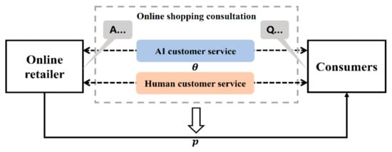 We consider an online marketplace, which consists of an online retailer and consumers. The online retailer can directly sell its products to consumers. Consumers can learn about and evaluate products through the pictures, text, and online reviews of the products provided by the online retailer [44]. The basic valuation of a consumer is a draw from a uniform distribution [45,46]. Consumers make a one-time purchase decision. Moreover, the online retailer also provides online customer service to help consumers resolve problems they may encounter during the shopping journey. We also denote this online customer service as the online shopping consulting service. Figure 1 shows the model structure under customer service. We use subscript to denote different customer service models and , where denotes that the online retailer provides human customer service and denotes that the online retailer provides AI customer service. In this paper, online customer service is also called online shopping consulting services.