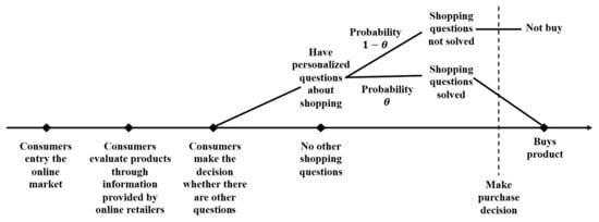 In this model, we consider two types of consumers, and we follow Chen et al. [47], Montes et al. [48], and Tang et al. [49] to segment the consumer market. We assume that the total amount of consumers is normalized to one, and each consumer has a unit demand. The data show that one-third of consumers believe that one of the key characteristics of good customer service is the ability to resolve consumer problems [50]. This suggests that there are consumers who have shopping problems and need to use the customer service of online retailers when shopping online. Therefore, we assume that the quantity of consumers () is the quantity of consumers who still have personalized shopping questions after browsing through the information provided by the online retailer, such as the text and pictures of the product. Correspondingly, is the quantity of consumers who do not have other shopping-related questions after browsing through the information provided by the online retailer. A questionnaire study by Daroch et al. [51] found a one-half split between consumers who make more than six online purchases per month and those who make less than six online purchases per month. This provides data support for consumer segmentation. Moreover, this consumer segmentation corresponds to reality. When consumers are shopping online, some of them will buy directly by browsing the product pictures, text introduction, and online reviews provided by online retailers. However, the other consumers cannot resolve their personalized problems through the information provided by online retailers, and at this time, they need the customer service offered by online retailers.