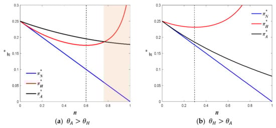 Therefore, in this case, the online retailer’s profits are provided by . The optimal price and service level can be obtained by maximizing the streamer’s profit. By solving the profit and organizing the results, we can obtain Lemma 2.