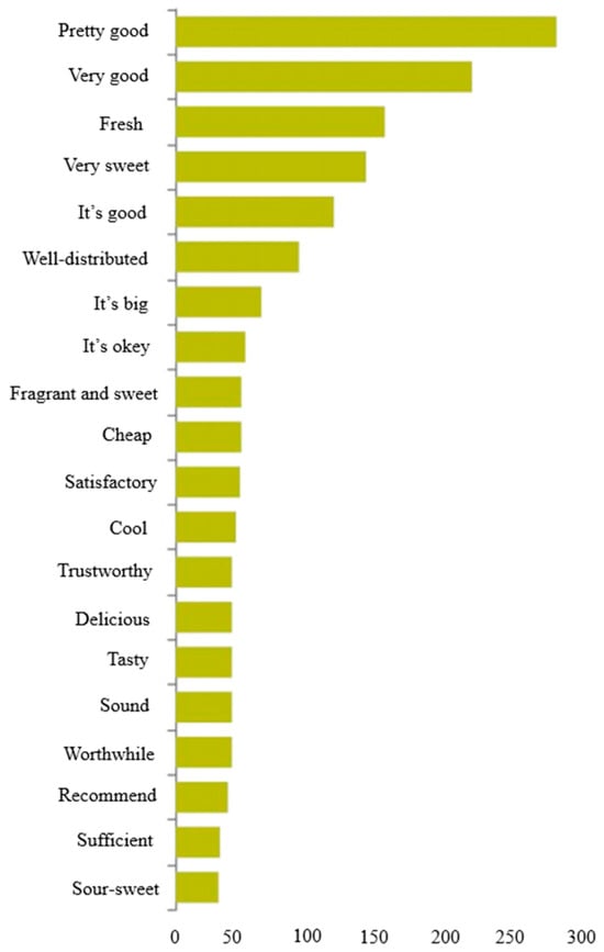 Figure 3 shows that the words that consumers use more frequently, such as “very good”, “pretty good”, “satisfactory”, “worthwhile”, etc., reflecting that the product meets consumers’ needs and is attractive and worth buying. Furthermore, lexical descriptors such as “fresh” (core attribute), intensifier-modified terms (e.g., “very sweet”), and evaluative adjectives (“cheap”, “tasty”) epistemologically manifest consumers’ multidimensional perception patterns, as evidenced through our sentiment-embedded text-mining framework.