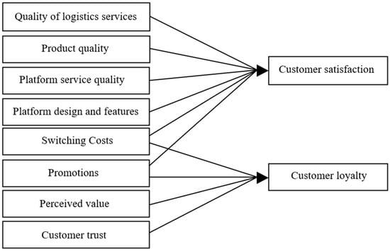 Through the analysis, sorting, and summarization of the results in this chapter, it provides a basis for determining satisfaction-related questions in the design of the survey data questionnaire and the selection of models. The model constructed in this paper includes 10 primary dimensions, illustrated in Figure 4. These dimensions comprehensively reflect consumers’ multi-faceted demands and attitudes towards products and platforms. By comprehensively drawing on the ACSI, ECSI, and CCSI models and conducting word frequency analysis on customer reviews through data crawling, we were able to construct the theoretical model we hypothesize, as shown in Figure 4.