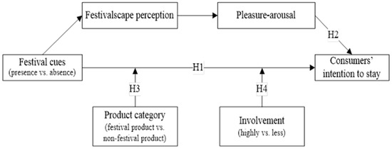 As such, consumers with lower involvement are more likely to notice the festival cues and perceive the festivalscape. According to the SOR theory, festival cues are conceptualized as specific atmospheric stimuli that arouses an individual and then drive their behavioral response. The enhancement effect of the presence of festival cues on consumers’ intention to stay is significant. Conversely, consumers who are more highly involved focus on key product information, for example, price, quality, color, style, or texture. Thus, the effect of the presence of festival cues will be attenuated. The difference between the effects of the presence or absence of festival cues will not be significant. Thus, we propose: