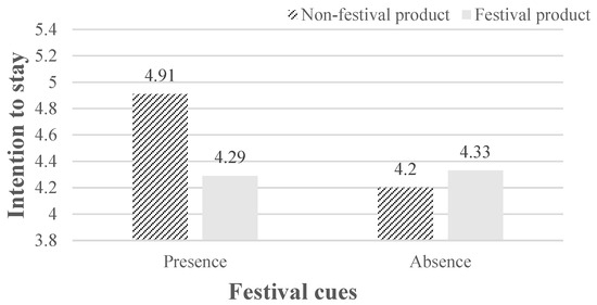 Product category moderates the effect of festival cues on consumers’ intention to stay. Specifically, for non-festival products, the presence of festival cues significantly increases consumers’ intention to stay compared with the absence of festival cues, but for festival products, the effect of festival cues on consumers’ intention to stay is not significant.