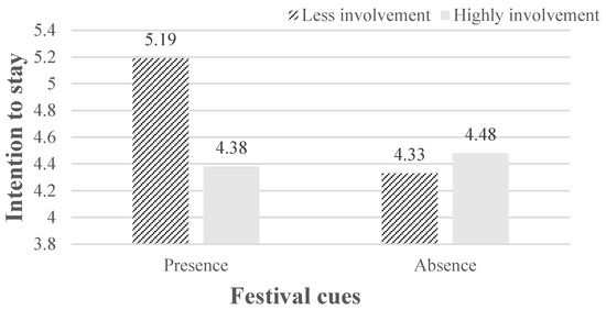 We conducted a two-way ANOVA analysis, and the results showed that the main effect of involvement was significant (F (1, 245) = 7.42, p = 0.007), and the interactions of the festival cues and involvement were significant (F (1, 245) = 15.20, p < 0.001). Results of simple effect analysis (see Figure 3) showed that for low involvement participants, the presence of festival cues led to a stronger intention to stay (Mabsence = 4.33, Mpresence = 5.19, F (1, 245) = 23.73, p < 0.001), but for highly involved participants, there was no significant difference in intention to stay between the presence and absence of festival cues (Mabsence = 4.48, Mpresence = 4.38, F (1, 245) = 0.29, p = 0.59). Thus, H4 was supported.