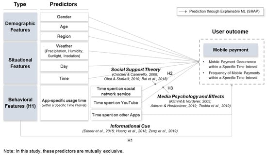 Behavioral factors, particularly previous mobile usage behavior, also play an important role in shaping mobile payment decisions. A user’s device usage history and application interaction patterns are important behavioral predictors of mobile payment behavior [21,22,23]. Dinner et al. [21] found that active engagement with branded mobile applications considerably increases the likelihood of purchases, emphasizing the mediating role of sustained application usage between application adoption and purchasing behavior. Similarly, Huang et al. [22] performed a large-scale, cross-platform study, finding that consumers’ browsing and interaction patterns in mobile shopping applications can be used to predict their purchase decisions. This finding indicates that subtle usage signals, such as dwell time and revisit frequency, are key indicators. Zeng et al. [23] further highlighted that when integrated with recommendation system data, user behavior patterns during peak shopping periods, such as shopping festivals, can effectively predict purchase outcomes. The duration of application usage is also a key factor in predicting mobile user behavior [12,24]. Liao et al. [24] demonstrated that analyzing historical application usage sequences allows for accurately predicting future application engagement, implying that usage duration and frequency and application transition patterns collectively provide strong predictive signals. Shin et al. [12] expanded these findings by demonstrating that application usage patterns are not random but can be modeled to predict future behavior, stressing contextual factors such as the time of day and user habits. Engaging with mobile applications can serve as an informational cue encouraging continued application usage and, in some instances, directly triggers mobile payment initiation in an application. For example, interacting with review applications, SNSs, or product comparison tools may guide users toward purchase decisions through mobile payments. Based on this discussion, we propose the following hypothesis: