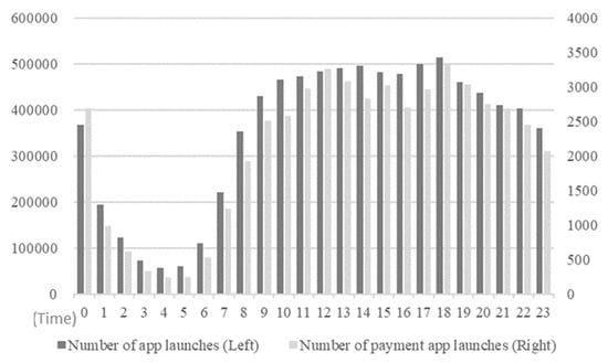 Additionally, in the classification model (Table 4), the demographic factor of age ranked 2nd while the regional variable ranked 14th. Meanwhile, in the regression model, age ranked 5th while the regional variable ranked 17th. These results indicate that, alongside behavioral factors, demographic factors contribute to predicting mobile payment usage. The findings are consistent with those of Bigne et al. [14] and Wang et al. [13], who emphasized that younger, more digitally savvy consumers tend to exhibit higher engagement in mobile commerce. Younger users tend to show a higher propensity to engage in mobile payment behavior. Furthermore, the high ranking of the sunlight variable implies that people are more likely to make purchases during the day rather than after sunset. Figure 3 depicts the total number of application launches per hour for all users. The data support the finding that sunlight is a strong predictor of mobile purchase behavior. Peaks in payment activity were observed at around midday and immediately after regular working hours. This finding implies that time may contribute to predicting purchase behavior. This situational factor supports previous findings by De La Rosa and Tully [18], who noted that temporal variables considerably influence consumer spending behavior. Overall, the results validate the exploratory hypotheses, indicating that behavioral factors, hedonic media usage, social engagement, and situational conditions contribute considerably to mobile payment behavior.