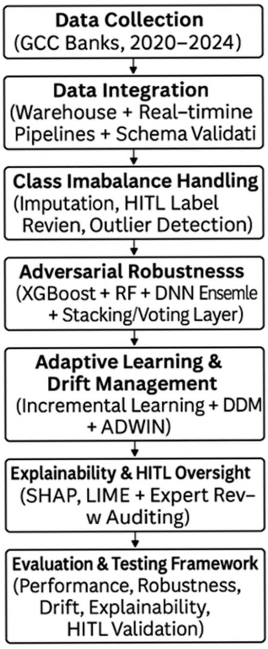 Real-world transaction data from GCC financial institutions supports the evaluation, with performance measured across fraud recall, model robustness, drift recovery, explainability, and operational latency. The study adopts a design science research (DSR) methodology to ensure that both technical efficacy and institutional constraints are addressed in the framework’s design and validation.