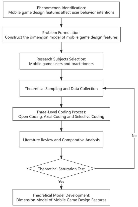 Unlike hypothesis-driven research paradigms, grounded theory does not presuppose variables or their relationships. Instead, it adopts an inductive approach, building theoretical frameworks through progressive analysis and conceptualization of empirical data [43,44]. This characteristic makes it particularly suitable for the current study, as it addresses the lack of systematic theoretical foundations in existing mobile game design feature classifications. The methodology’s flexibility allows for the emergence of novel conceptual frameworks that accurately reflect the complex realities of mobile game design and user behavior.