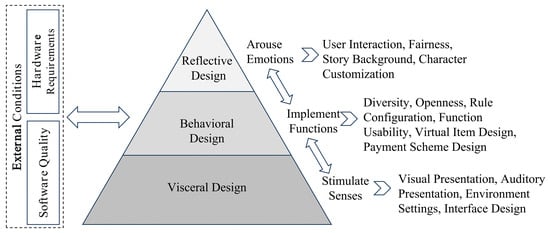 The analysis reveals that instinctive-level design features serve as the presentation form of behavioral-level features, while reflective-level features evoke deeper emotional responses and cognitive reflections based on users’ behavioral interactions. External conditions, including hardware requirements and software quality, primarily depend on the technical demands for implementing behavioral-level features. Conversely, all design features reciprocally influence the presentation and functionality of behavioral-level characteristics.