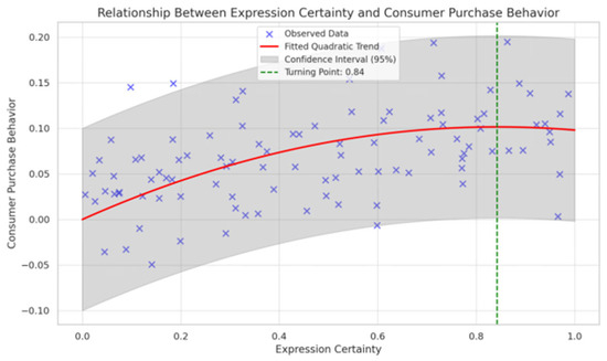 First, Model 1 examines the relationship between all control variables and the dependent variable. Model 2 adds expression certainty to Model 1, aiming to test the main effect of expression certainty on purchase behavior. The results show that the likelihood ratio test for the negative binomial regression is significant (χ2(10) = −6442.37, p < 0.001), indicating that the model has a good fit. Moreover, expression certainty has a significant positive effect on purchase behavior (β = 0.241, p < 0.001), which means that the streamer’s expression certainty can promote consumer purchase behavior. Next, Model 3 tests whether there is an inverted U-shaped relationship between expression certainty and purchase behavior through quadratic regression. Based on Model 2, the squared term of expression certainty was added. The likelihood ratio test for Model 3 is significant (χ2(11) = −6328.24, p < 0.001), and the AIC value significantly decreased, indicating an improved model fit. At the same time, the squared term of expression certainty has a significantly negative coefficient (β = −0.143, p < 0.001), indicating that there is an inverted U-shaped relationship between the streamer’s expression certainty and consumer purchase behavior. Subsequently, we further examined the turning point to support the inverted U-shaped relationship. As shown in Figure 2, the turning point for expression certainty is 0.84, which lies in the middle of the observed values, further supporting the inverted U-shaped influence of the streamer’s expression certainty on consumer purchase behavior.