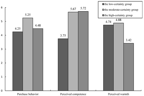 In contrast, participants in the moderate-certainty group (M = 4.88, SD = 1.42; Fisher’s LSD, p < 0.001) and low-certainty group (M = 4.74, SD = 1.25; Fisher’s LSD, p < 0.001) rated the streamer’s perceived warmth higher than participants in the high-certainty group (M = 3.42, SD = 1.21). There was no significant difference in perceived warmth between the moderate- and low-certainty groups (Fisher’s LSD, p = 0.277) (see Figure 3 for detailed results).