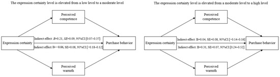 For testing the mediating effects of perceived competence and perceived warmth, we conducted a mediation analysis using PROCESS Model 4 with 5000 bootstrap resamples [13]. By comparing the data of the moderate-level group with the low-level group, we found that the indirect effect of expression certainty through perceived competence was significant (B = 0.21, SE = 0.09, 95% CI: 0.07–0.37), while the indirect effect through perceived warmth was not significant (B = −0.06, SE = 0.08, 95% CI: −0.18–0.12). Conversely, by comparing the data of the moderate-level group with the high-level group, we found that the indirect effect of expression certainty through perceived warmth was significant (B = 0.31, SE = 0.07, 95% CI: 0.24–0.52), while the indirect effect through perceived competence was not significant (B = 0.04, SE = 0.08, 95% CI: −0.14–0.16). These findings provide evidence for Hypothesis 2, suggesting that the curvilinear relationship between the streamer’s expression certainty and consumer purchase behavior can be explained by a trade-off between perceived competence and warmth. Specifically, our results show that when the streamer’s expression certainty increases from low to moderate levels, the perceived competence of the streamer increases in the eyes of the consumer, but perceived warmth does not decrease. However, when the streamer’s expression certainty increases from moderate to high levels, consumers’ perceived warmth decreases, but perceived competence does not increase further. Given that both perceived competence and warmth can predict consumer purchase behavior, moderate expression certainty is the most ideal for promoting purchase behavior. See Figure 4 for detailed results.