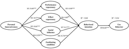 The influence of personal innovativeness on PE (0.68 ***), EE (0.57 ***), SI (0.66 ***), and FC (0.58 ***) are all positive and statistically significant. Therefore, hypotheses 1, 2, 3, and 4 are accepted.
