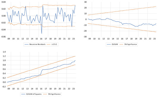 - Plotting the recursive estimates and confidence intervals provides useful information on possible structural breaks. For that purpose, we dropped the dummy variables and and analyzed the recursive residuals, CUSUM and CUSUM-of-squares, of the equation. The corresponding figures are presented in Figure 3. A visual inspection on recursive residuals shows one structural break in 2016, which coincides with the failed coup attempt in July 2016 and justifies the use of the dummy variable in our analysis. The CUSUM line stays within the critical bounds. Hence, the null hypothesis of parameter stability cannot be rejected, indicating a stable model. Similarly, the CUSUM-of-squares plot suggests stable variance.