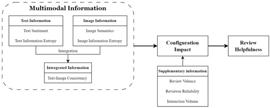 Therefore, this study divided the influencing factors of the helpfulness of multimodal online reviews into four parts: text information, image information, integrated information, and supplementary information. The text information category encompasses text sentiment and text information entropy. Image information includes image content and image information entropy. Integrated information includes image–text consistency. Supplementary information includes review valence, reviewer reliability, and volume of interactions. Among these factors, text information and image information are mainly used for external processing and essential processing, while integrated information and supplementary information play a role in the generation processing stage. In summary, the research framework based on CTML theory is shown in Figure 2.