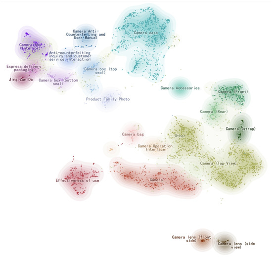 To explore the specific content of each review image and the product attributes involved, this study uses an unsupervised image clustering algorithm for feature recognition. The BLIP2-Chinese model, obtained by training 200 million Chinese image–text pairs for five epochs, was used to extract image features. The model is based on BLIP2 (Bootstrapping Language-Image Pre-training 2), which is a multimodal pre-training model [34]. Compared with traditional image feature extraction methods, the pre-training model helps understand the connection between images and texts based on semantic features, which helps to deeply explore the impact of images on the helpfulness of reviews. The model is characterized by efficient image–text alignment using less annotated data and has stronger cross-modal understanding capabilities compared to previous multimodal pre-training models. After the features are extracted from one single review image, an embedding tensor with a shape of 32 × 256 is obtained. The first dimension of the tensor is average pooled to generate a global 256-dimensional embedding vector for subsequent clustering and analysis. Again, the UMAP and HDBSCAN algorithms were used to reduce the dimension and cluster the embedding vectors of the 4324 images, resulting in a total of 20 cluster categories and 1 abnormal category, which is shown in Figure 4.