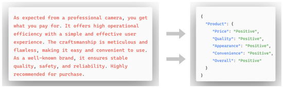 An aspect refers to a specific attribute or feature involved in an online review. It can be described as an attribute of an entity (such as “screen” or “battery life” in a mobile phone review) or an aspect of a service (such as “room cleanliness” or “customer service” in a hotel review). These aspects can be represented by keywords, phrases, or implicit features. To extract sentiment binary pairs, an aspect-based sentiment analysis pre-trained model was employed. [35]. The model is pre-trained on a supervised task of the Text2Text unified paradigm on 100 Chinese datasets and can effectively complete the aspect-level sentiment analysis task. The example is shown in Figure 5.