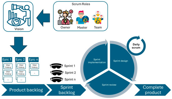 Central to Scrum’s effectiveness is the explicit definition of the vision (Figure 1), a high-level, strategic statement that describes the overall goals, target audience, and anticipated impact of the project. In the context of Scrum, the term Scrum Vision refers to this initial shared product vision, which is collaboratively established between key stakeholders (such as marketing, sales, and communication representatives) and the development team at the start of the project. The vision serves as a cohesive foundation that guides all subsequent activities, decision-making processes, and prioritizations throughout the project lifecycle, ensuring continuous alignment between the evolving product and stakeholder expectations [26]. By clearly defining the vision, Scrum ensures alignment and shared understanding among all the participants, fostering coherent and goal-oriented product development.