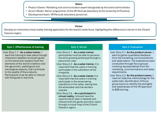 The Scrum implementation commenced with defining a clear and compelling vision for the project, formulated by the Product Owner, in collaboration with brand stakeholders. The vision articulated the overarching goal (Figure 2): developing an immersive virtual reality (VR) training application designed explicitly for the brand’s sales force, with a particular emphasis on conveying the distinctive terroir characteristics of the Chianti Classico region. This vision served as the guiding framework for subsequent development activities, ensuring alignment and coherence across the entire project lifecycle.
