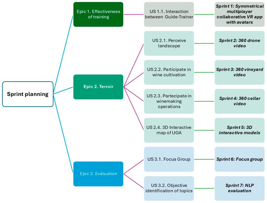The first Epic, labeled “Effectiveness of Training,” encompassed user stories focused on maximizing the educational impact of the VR training experience. A representative user story (User Story 1.1) emphasized that as a sales trainer, the training sessions should occur through dynamic interactions between the participants and an expert guide representing the brand. The guide’s role was defined as integrating the brand’s historical traditions and detailed explanations regarding the agronomic, pedological, and oenological aspects that are essential to the quality of the products. Additionally, real-time interactivity was highlighted as a fundamental requirement, enabling participants to actively engage with the expert guide and deepen their understanding.
